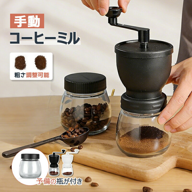 手挽きコーヒーミル 手動 珈琲ミル 保存用ビン1個付属 コーヒーグラインダー 粗さ調節機能 セラミック臼 滑り止め付き ガラス本体 コーヒー豆挽き器 水洗い可能 キャニスターセット 軽量 お手入れ簡単 アウトドア キャンプ