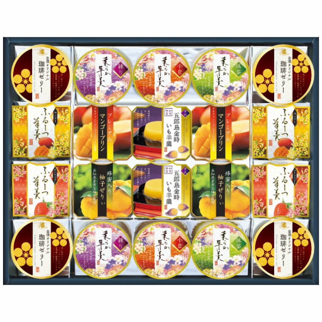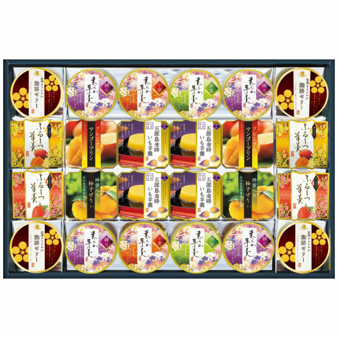 バラエティー豊かな9種類のデザートの詰合せです。いも羊羹、抹茶羊羹、練り羊羹、小倉羊羹、マンゴープリン、フルーツ羊羹、柚子蜂蜜ぜりぃ、珈琲ゼリー、などほっこり和を感じる素材を中心に詰合せたデザートギフトです。 内容量 五郎島金時いも羊羹80g・金澤オリジナル珈琲ゼリー52g各4個・プレミアムマンゴープリン75g・蜂蜜入り柚子ぜりぃ75g・ふるーつ羊羹60g(ストロベリー・マンゴー)各2個・柔らか羊羹60g(練り4個・抹茶・小倉各2個) 製造生産地 日本製 賞味期間 製造日より常温約180日 アレルゲン 乳成分・大豆 総重量 2212g 【注意事項】 商品の詳細はご注文前にメーカーサイトもしくはカタログ等で御確認ください。