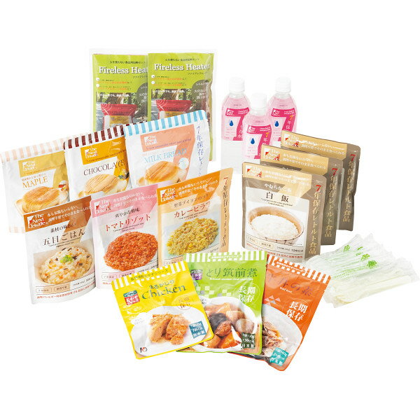 7年保存3日分保存食セットCompleted Evo 7−Years■商品情報■●白飯230g×3、カレーピラフ230g・五目ごはん230g・トマトリゾット230g・とり筑前煮120g・牛丼の素140g・まるかじりチキン60g・ミルクブレッド100g・チョコレート100g・メープル100g×各1、保存水(硬度0、500ml)×3●ファイアレスヒーターセット(加熱袋1袋/加熱剤60g3袋)×2、スプーン×6本、先割れスプーン×3本阪神、東日本大震災時、被災者が何より求めていたのは「温もり」だった。「食」から心身共に温める、災害保存食の完全版。熱々に温めて食べる7年保存食3日分セット。防災のプロたちが迷わず選んだ完成型が今ここに!■アレルギー商品情報■卵:あり 乳成分:あり 小麦:あり えび:なし かに:なしそば:なし 落花生:なし くるみ:なし アーモンド:なしあわび:なし いか:なし いくら:なし オレンジ:なし 牛肉:ありキウイフルーツなし さけ:なし さば:なし大豆:あり 鶏肉:あり バナナ:なし 豚肉:なしカシューナッツ:なし やまいも:なし りんご:ありゼラチン:なし もも:なし ごま:なし魚介類:なし マカダミアナッツ:なしお中元、お歳暮、内祝など様々な贈答・ギフトに最適♪日頃の感謝を形にして贈ってみませんか?喜ばれること間違いなし・7営業日前後でメーカーから直送■ ギフト、熨斗入れに関して ■熨斗入り発送をご希望の場合、「表書き」「名入れ」をご注文画面に進んでいただき、備考欄にご記入ください