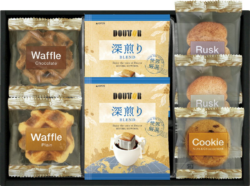 ドトールコーヒーと、甘さを抑え軽い食感に仕上げた馴染みのあるシュガーラスク、香ばしいココナッツの風味が広がるさくっとした軽い食感のココナッツラスクに、ベルギー産の粒状砂糖「パールシュガー」を加え、食感にアクセントをつけた、程よい甘さのプレーンワッフル、やわらかな生地に、カリカリとした食感がアクセントのチョコレート風味のチョコワッフル、爽やかな甘さの風味が心地よいレモンの香りが活きるアーモンド風味のレモンケーキのセットです。 ドトールコーヒーと、甘さを抑え軽い食感に仕上げた馴染みのあるシュガーラスク、香ばしいココナッツの風味が広がるさくっとした軽い食感のココナッツラスクに、ベルギー産の粒状砂糖「パールシュガー」を加え、食感にアクセントをつけた、程よい甘さのプレーンワッフル、やわらかな生地に、カリカリとした食感がアクセントのチョコレート風味のチョコワッフル、爽やかな甘さの風味が心地よいレモンの香りが活きるアーモンド風味のレモンケーキのセットです。 品名:ドトールコーヒー&スイーツセレクション 品番:DT-20 セット内容:ドトールドリップコーヒー(7g)×4、ナッツとチョコのざっくりクッキー×2、ラスク(シュガー・ココナッツ)・ワッフル(プレーン・チョコ)×各1 賞味期間:常温6ヶ月 アレルゲン:卵・乳・小麦 箱サイズ:21×29×4.5cm 箱入重量:0.2kg 注釈:※デザイン・内容等が変更になる場合がございます。