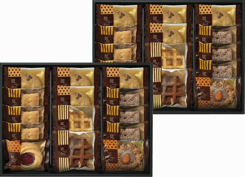 ブルーベリージャムをトッピングした甘酸っぱいロシアケーキやアーモンドをトッピングしたロシアケーキ、食感にアクセントをつけた、程よい甘さのプレーンワッフル、やわらかな生地に、カリカリとした食感がアクセントのチョコレート風味のチョコワッフル、パイ、クッキーなどを詰め合わせたこだわりのギフトです。 ブルーベリージャムをトッピングした甘酸っぱいロシアケーキやアーモンドをトッピングしたロシアケーキ、食感にアクセントをつけた、程よい甘さのプレーンワッフル、やわらかな生地に、カリカリとした食感がアクセントのチョコレート風味のチョコワッフル、パイ、クッキーなどを詰め合わせたこだわりのギフトです。 品名:アンドスイーツセレクション 品番:ANZ-302 セット内容:ナッツとチョコのざっくりクッキー×8、スクエアパイ(プレーン・ショコラ)×各6、ロシアケーキ(ブルーベリーサン・チョコアーモンド)・ワッフル(プレーン・チョコ)×各2 賞味期間:常温4ヶ月 アレルゲン:卵・乳・小麦 箱サイズ:21.2×29.2×9cm 箱入重量:0.7kg 注釈:※お取り寄せの場合、お届けまでに数日掛かる事がございます。※デザイン・内容等が変更になる場合がございます。