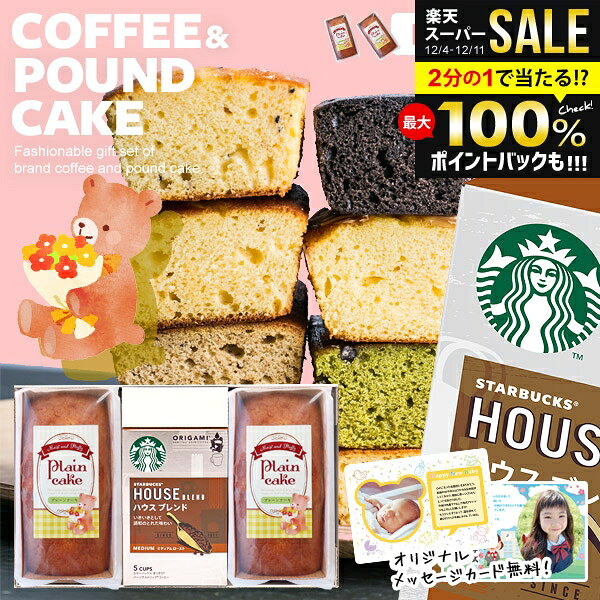 ※スターバックスコーヒー1個はお好みの種類をお選び下さい。パウンドケーキ プレーンが必ず2個入ります。※商品リニューアルに伴いコーヒーの内容量が5袋入→4袋入へ変更となりました。予めご了承のうえお買い上げ下さい。●商品内容/スターバックス オリガミ ドリップコーヒー(種類を選択)×1、パウンドケーキ プレーン×2●商品種類/スターバックス オリガミ ドリップコーヒー(ハウスブレンド・パイクプレイスロースト・カフェベロナ(9g×4袋)、ディカフェ ハウス ブレンド(8.4g×4袋))、パウンドケーキ プレーン●箱サイズ/約28.5×18×10cm●賞味期限/スターバックスコーヒー:製造後270日、パウンドケーキ:製造後120日4種類の中からお好きに選べるスターバックスのドリップコーヒーと、料亭プロデュースのしっとりふんわり焼き上げられたパウンドケーキの詰め合わせ。ティータイムを素敵に彩るおしゃれでかわいいギフトセットです。 メーカー都合により予告なく商品のデザイン・内容が変更になる場合がございます。 ギフトのことならジャパンギフトにおまかせ下さい。様々なギフトシーンに。内祝 内祝い お祝い返し ウエディング ウェディングギフト ブライダルギフト 引き出物 引出物 結婚引き出物 結婚引出物 結婚内祝い 出産内祝い 命名内祝い 入園内祝い 入学内祝い 卒園内祝い 卒業内祝い 就職内祝い 新築内祝い 引越し内祝い 快気内祝い 開店内祝い 二次会 披露宴 お祝い 御祝 結婚式 結婚祝い 出産祝い 初節句 七五三 入園祝い 入学祝い 卒園祝い 卒業祝い 成人式 就職祝い 昇進祝い 新築祝い 上棟祝い 引っ越し祝い 引越し祝い 開店祝い 退職祝い 快気祝い 全快祝い 初老祝い 還暦祝い 古稀祝い 喜寿祝い 傘寿祝い 米寿祝い 卒寿祝い 白寿祝い 長寿祝い 金婚式 銀婚式 ダイヤモンド婚式 結婚記念日 ギフト ギフトセット セット 詰め合わせ 贈答品 お返し お礼 御礼 ごあいさつ ご挨拶 御挨拶 プレゼント お見舞い お見舞御礼 お餞別 引越し 引越しご挨拶 記念日 誕生日 父の日 母の日 敬老の日 記念品 卒業記念品 定年退職記念品 ゴルフコンペ コンペ景品 景品 賞品 粗品 お香典返し 香典返し 志 満中陰志 弔事 会葬御礼 法要 法要引き出物 法要引出物 法事 法事引き出物 法事引出物 忌明け 四十九日 七七日忌明け志 一周忌 三回忌 回忌法要 偲び草 粗供養 初盆 供物 お供え お中元 御中元 お歳暮 御歳暮 お年賀 御年賀 残暑見舞い 年始挨拶 人気 老舗 話題 のし無料 メッセージカード無料 ラッピング無料 大量注文 福袋などギフト以外のご自宅用商品も多数。バレンタインデー バレンタイン ひなまつり ホワイトデー 七夕 ハロウィン 七五三 クリスマスなどのイベント用ギフトも。年代別 10代 20代 30代 40代 50代 60代 70代 80代 90代まで幅広く取り揃え。ご予算別には100円 500円 1000円 1500円 2000円 2500円 3000円 4000円 7000円 5000円 10000円 15000円 30000円など低額から高額品まで。各種のしサービス ご購入前の簡単なご指定で、のし対応いたします。のし対応について ラッピングサービス 選べる包装紙は8種類+おまかせイベント用包装紙をご用意。包装紙・ギフトラッピングについて メッセージカード・命名札 写真入りオリジナルメッセージカードや命名札が作れるツールをご用意。メッセージカード・命名札について \ スタバは当店におまかせ!! / 2個入セット 3個入セット 4個入セット