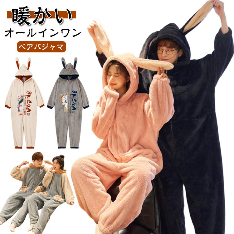 着ぐるみ パジャマ 大人用 兎耳付き 可愛い ペア パジャマ もこもこ レディース メンズ 着る毛布 動物 ルームウェア ペアパジャマ 冬 かわいい 部屋着 オールインワン 暖かい 修学旅行 中学生 高校生 韓国 フード付き 着ぐるみ風 前開き 夫婦 結婚祝い プレゼント 新年