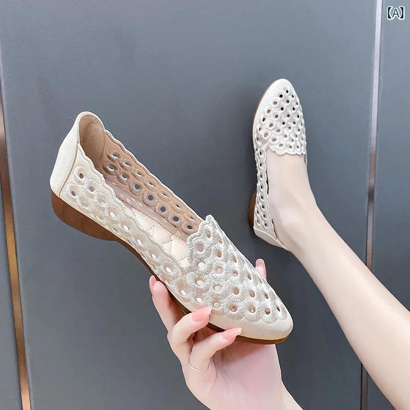 レディース ワークシューズ 牛 すじ ソフト ソール シューズ 春と 夏の 新しい 豆の 靴 中空 通 気性 妊婦の サンダル 女性の 母親の 靴 フラット ドライビングシューズ