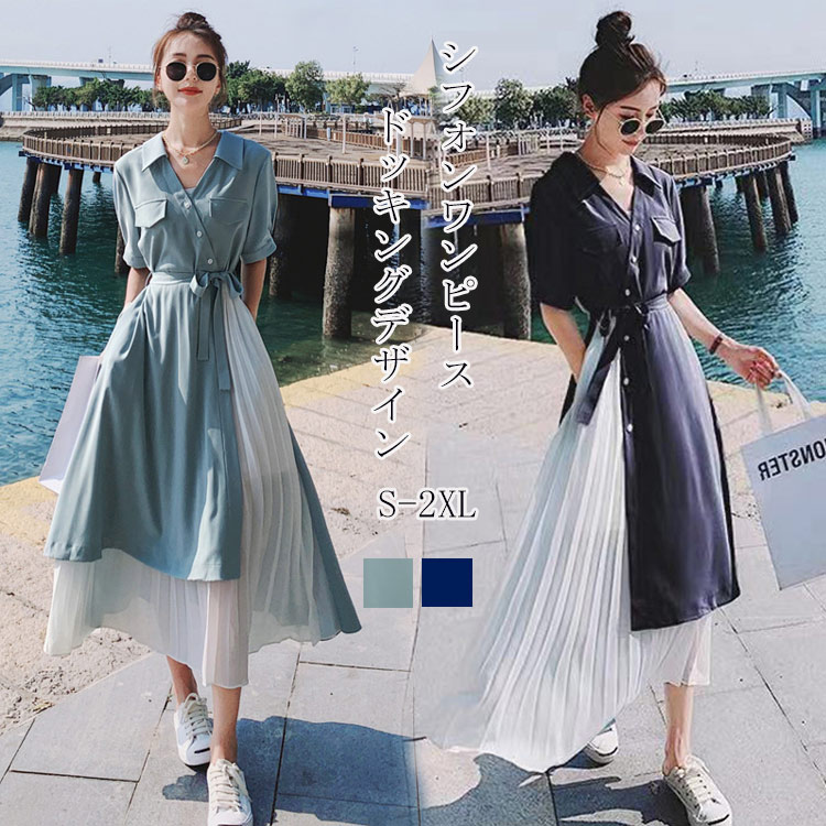 シャツワンピース レディース 春 夏 プリーツワンピース 半袖 シフォン ドッキング プリーツ 折り襟 ワンピース Aライン フレア リボン ロングワンピース ゆったり 体型カバー きれいめ ミモレ丈 夏ワンピ 切り替え シャツワンピ 大人 おしゃれ カジュアル オフィス 送料無料