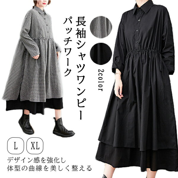 シャツワンピース レディース ワンピース 長袖 ワンピ ロングワンピース ドッキングワンピース シャーリング ゆったり パッチワーク 切り替え 折り襟 体型カバー カジュアル 着痩せ きれいめ お洒落 大人可愛い ウエストマーク 無地 チェック柄 前開き おしゃれ 春 秋