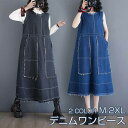 ロングワンピース レディース 綿混 ノースリーブ デニムワンピース ラウンドネック ベルト Aライン フレアワンピース 膝下丈 丸首 体型カバー 抜け感 大きいサイズ ワンピース ロング丈 着痩せ デニム ドッキング ポケット付き 春夏 無地 ブラック ブルー 可愛い 送料無料