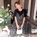 ワンピース レディース ブラック ドッキングワンピース 小花柄 キャミソール 半袖 ラウンドネック ミディ丈 ハイウエスト ポリエステル素材 ゆったり フレンチスタイル エレガント 体型カバー 春夏