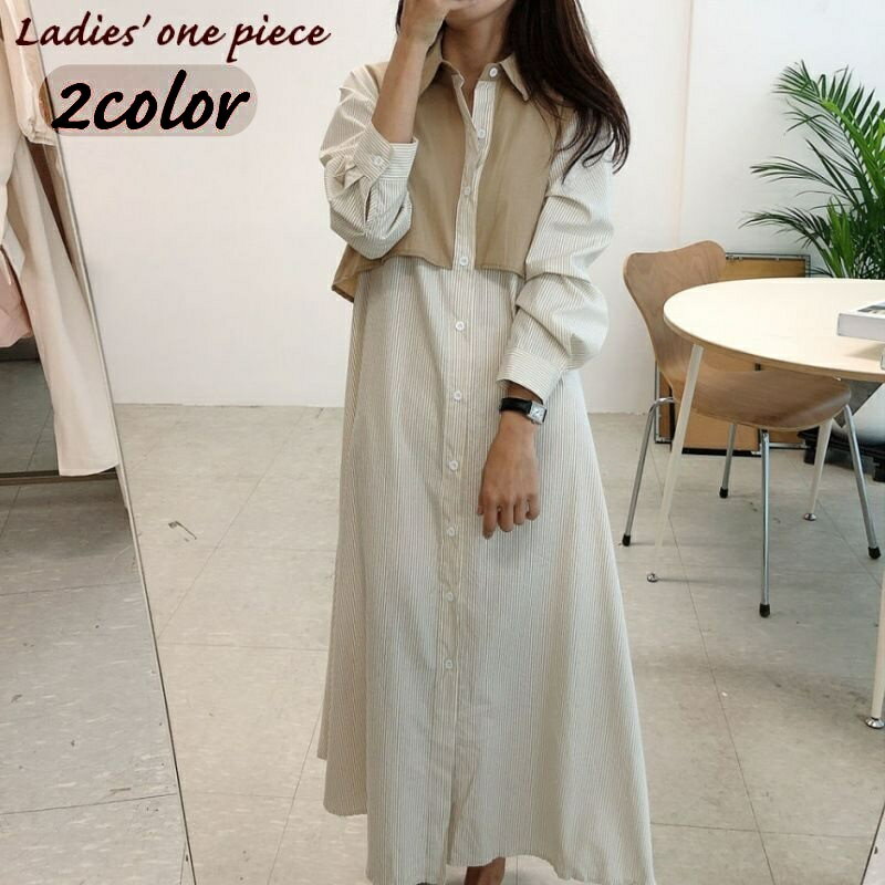 送料無料 シャツワンピース レディース 女性用 長袖 ミモレ丈 ロング丈 フェイクレイヤード 重ね着風 Aライン スタンダードカラー ストライプ ウエストひも おしゃれ 可愛い カジュアル 前ボタン おでかけ 普段使い 婦人用