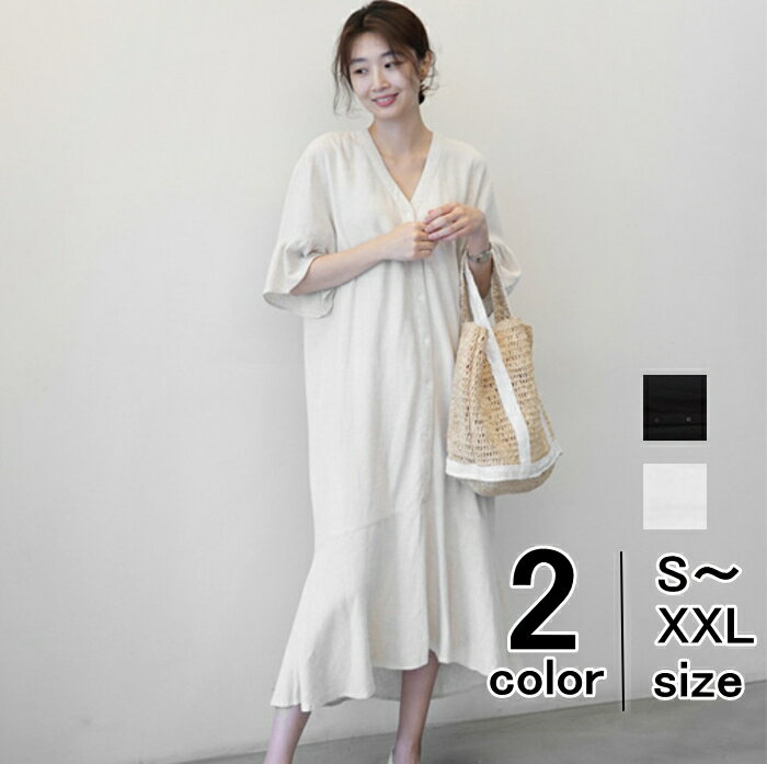 ワンピース シャツワンピ フレアスリーブ 無地 Vネック フレア ロングワンピ ロング丈 五分袖 ブラック ホワイト S M L XL XXL レディース メール便送料無料おうちコーデ (アパレル)