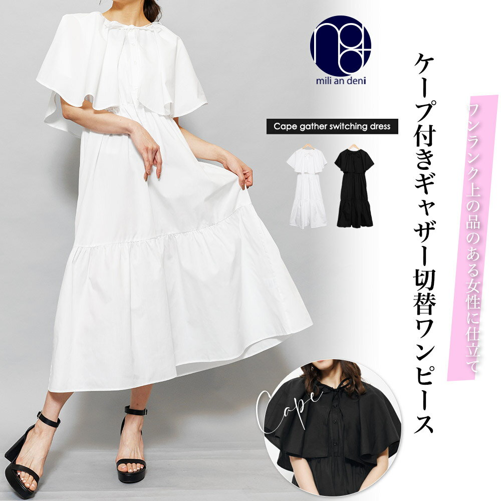 【17%OFFクーポン☆】ブロードケープ付きギャザー切替ワンピース シャツワンピース 半袖 ロング丈 ミモレ丈 M ワンピース きれいめ ゆったり レディース 秋 冬 春 ミリアンデニ