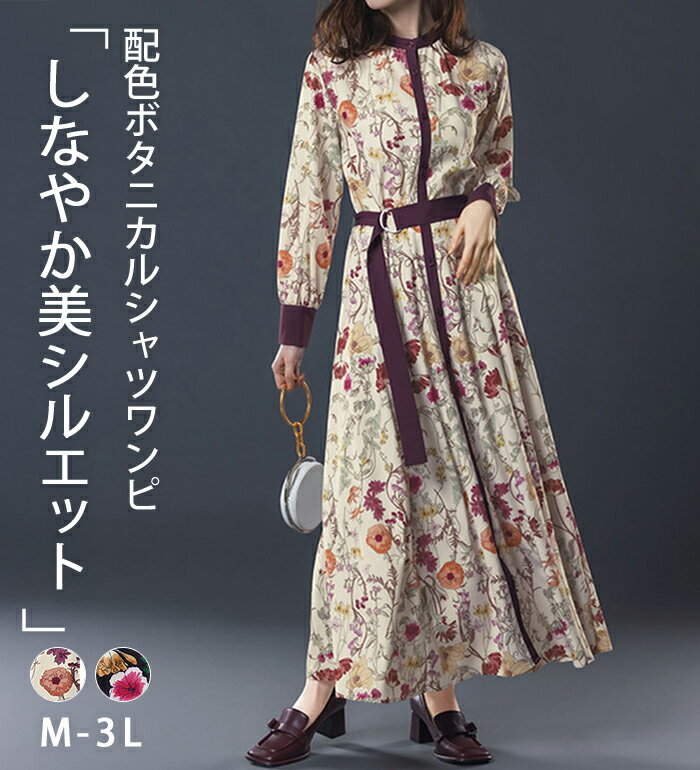 【★本日18時よりP10倍★】 配色ボタニカルシャツワンピース レディース 秋 冬 シャツワンピース ピンクベージュ系/ブラック系 M-3L