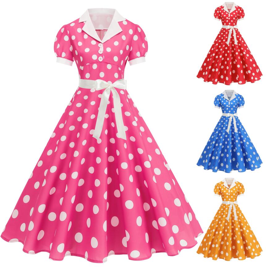 レディース レトロドレス ワンピース 水玉 ドット柄 リボン付き 半袖 Aライン ダンス衣装 フレアワンピース コスプレ 着?せ コスチューム パー 演出服 団体服 社交ダンスウェア