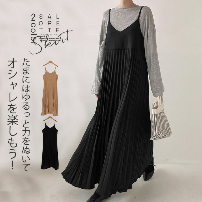 ジャンパースカート ワンピース ノースリーブ プリーツワンピース サロペットスカート キャミワンピ きれいめ サロペット ロング丈 ミモレ丈 レディース Aライン 春 夏 秋 着回し レイヤード ゆったり シンプル おしゃれ 体型カバー 20代 30代 40代 ベージュ ブラック