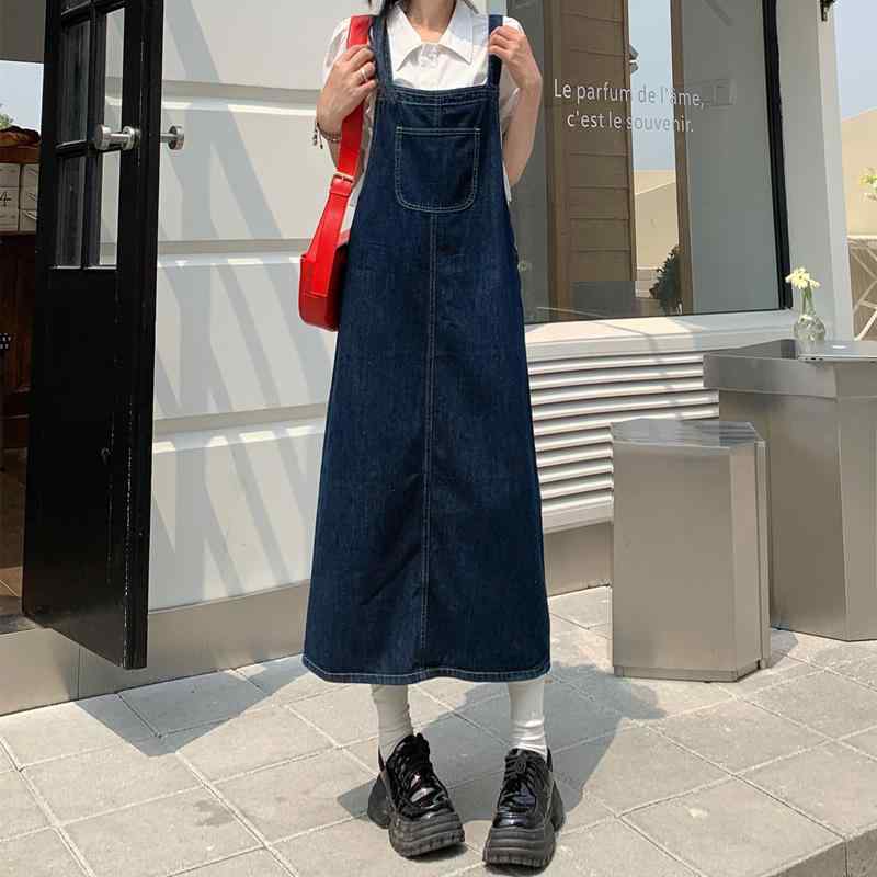デニムワンピース レディース MJB 2024 春夏 ダーク ブルー ミディアム 丈 スリミング デニムスカート レディース 韓国 カレッジ スタイル スモール サスペンダー ドレス