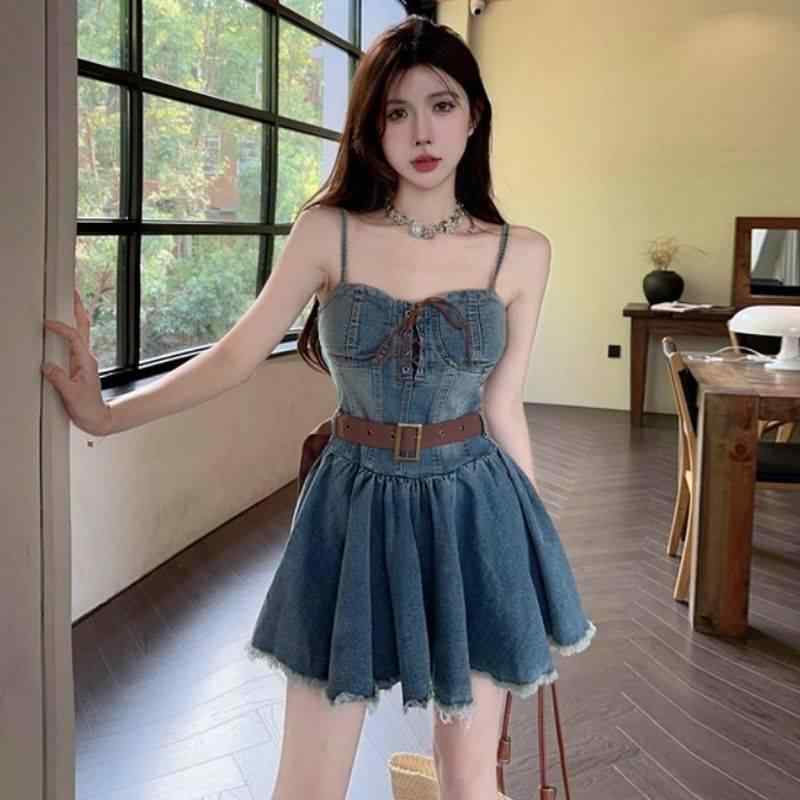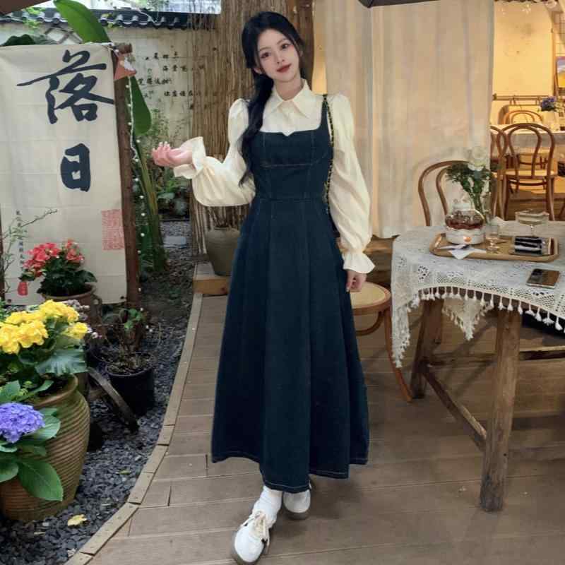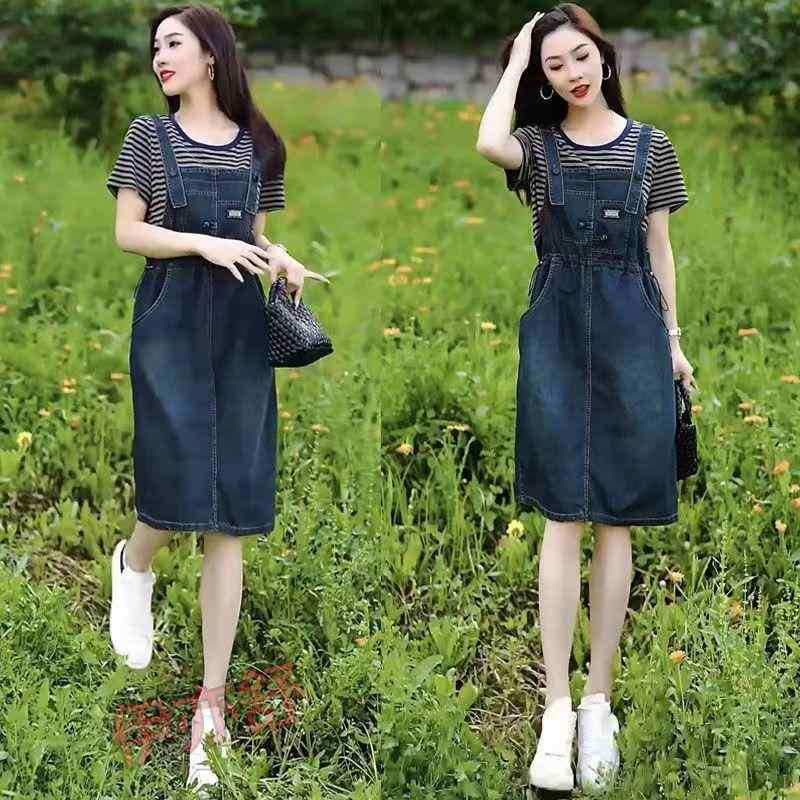 デニムワンピース レディース 春の レディース やや 太った 年齢を 減らす スーツ 大きいサイズ スリム 肉を カバー 優しい スタイル デニム サスペンダー ドレス シャツ ツーピース
